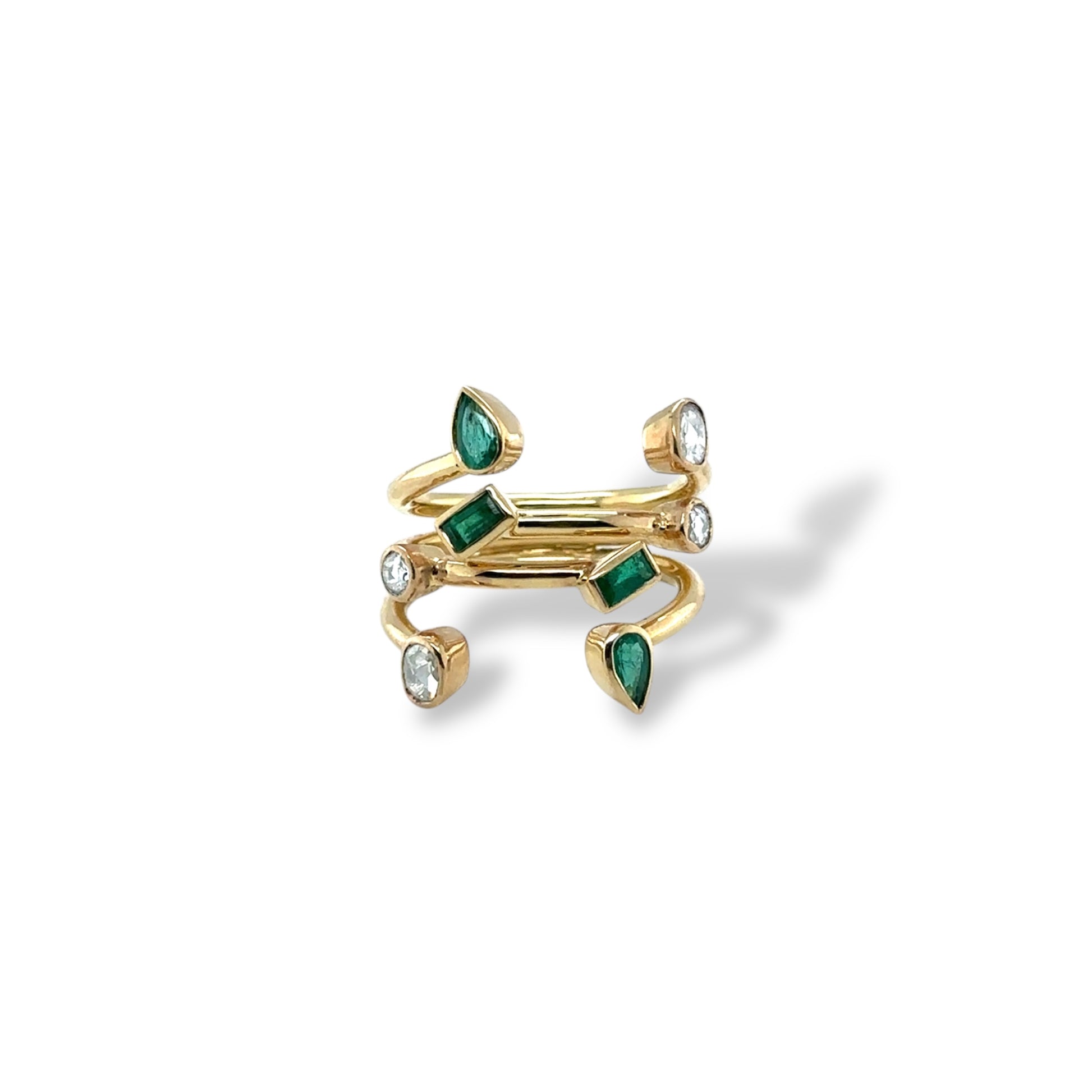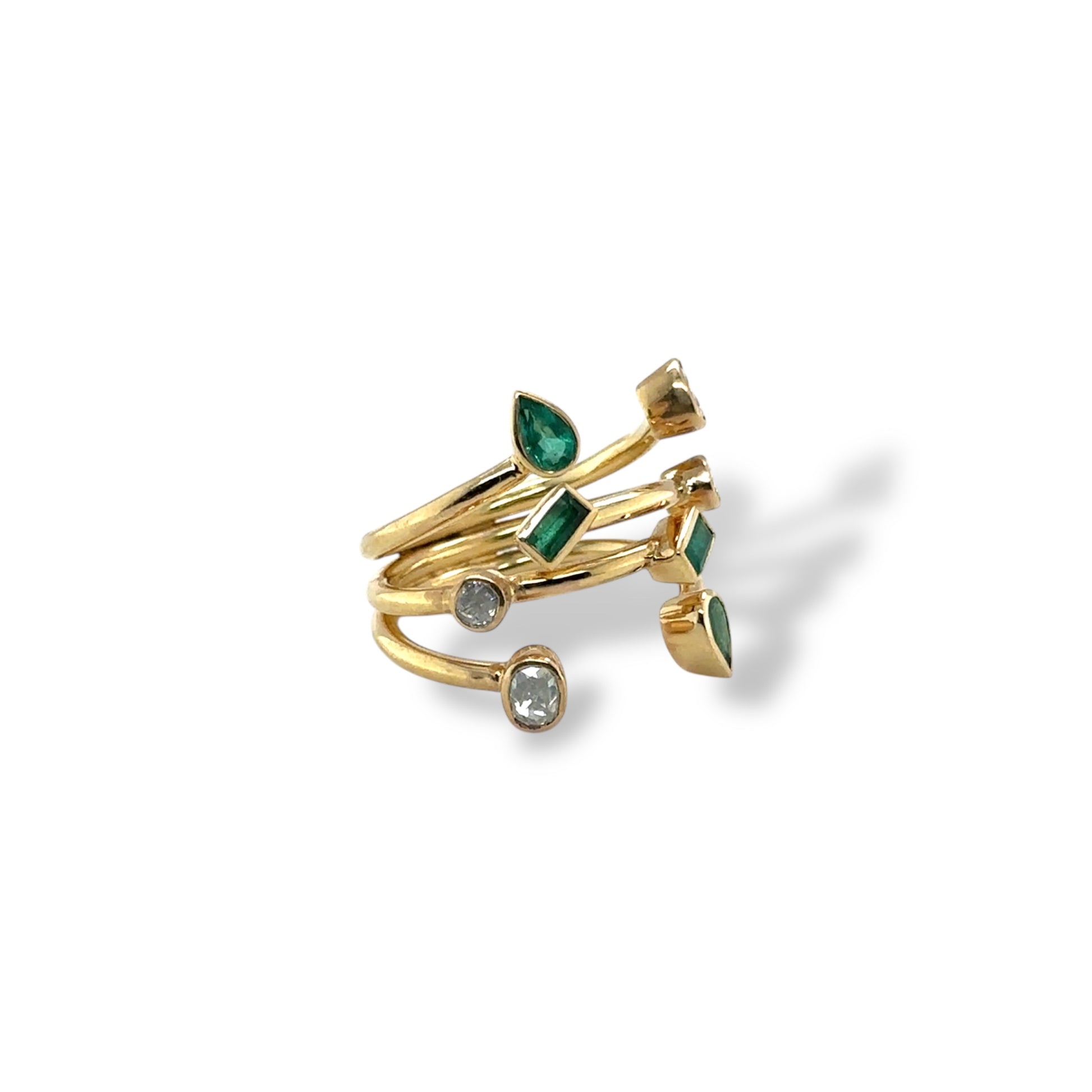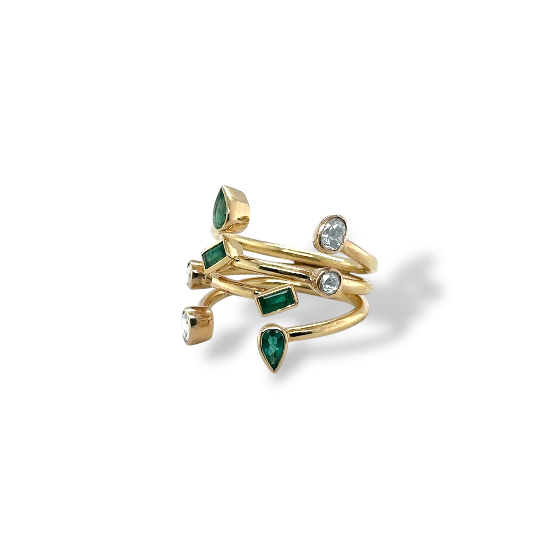This sculptural ring captures the essence of modern luxury through its open, geometric design. Crafted in 18k gold, it features bezel-set diamonds and emeralds in varied cuts that dance across the hand like light filtering through leaves. The interplay of precious stones creates a dynamic, organic composition that balances clean lines with natural beauty. A refined piece that speaks to understated elegance and contemporary craftsmanship.