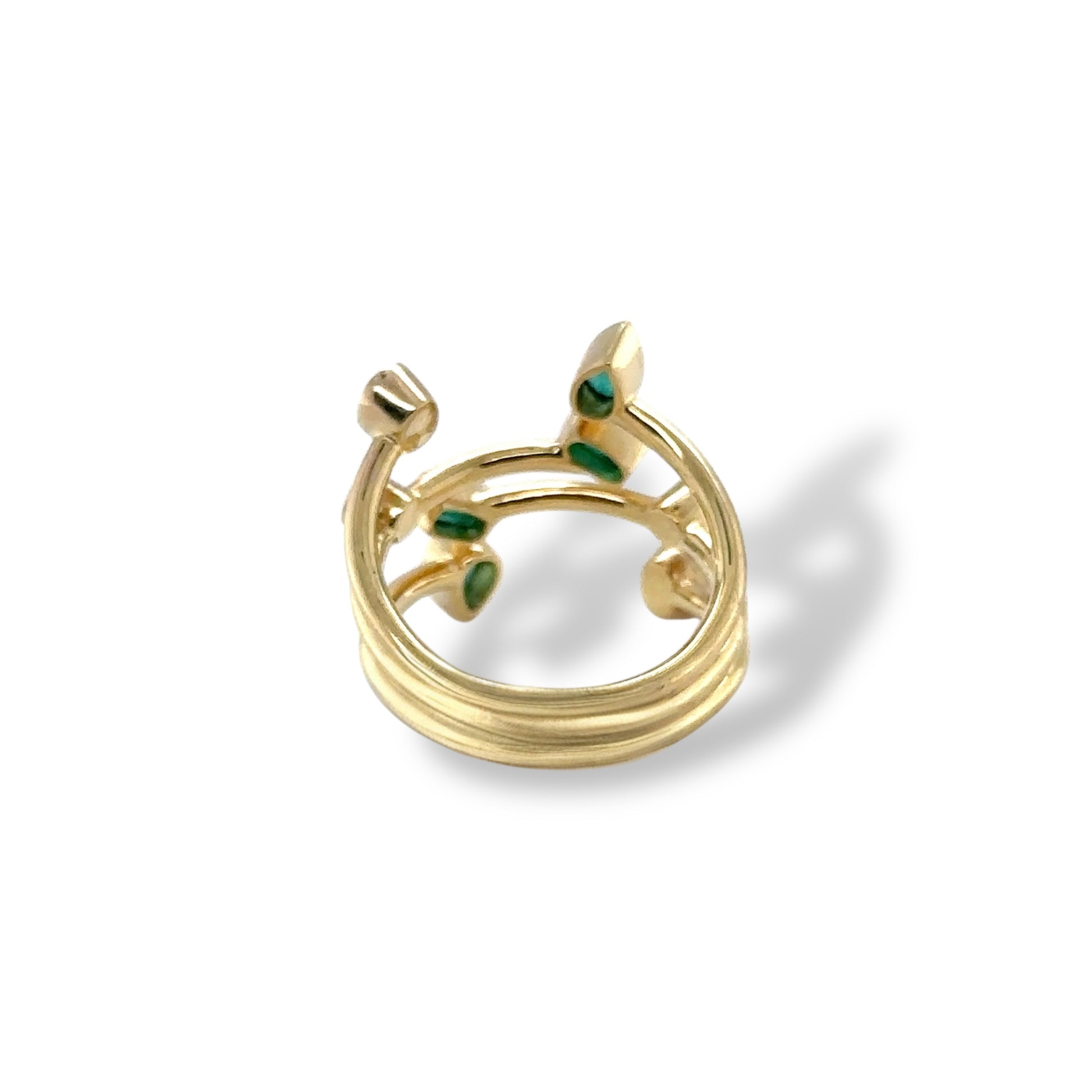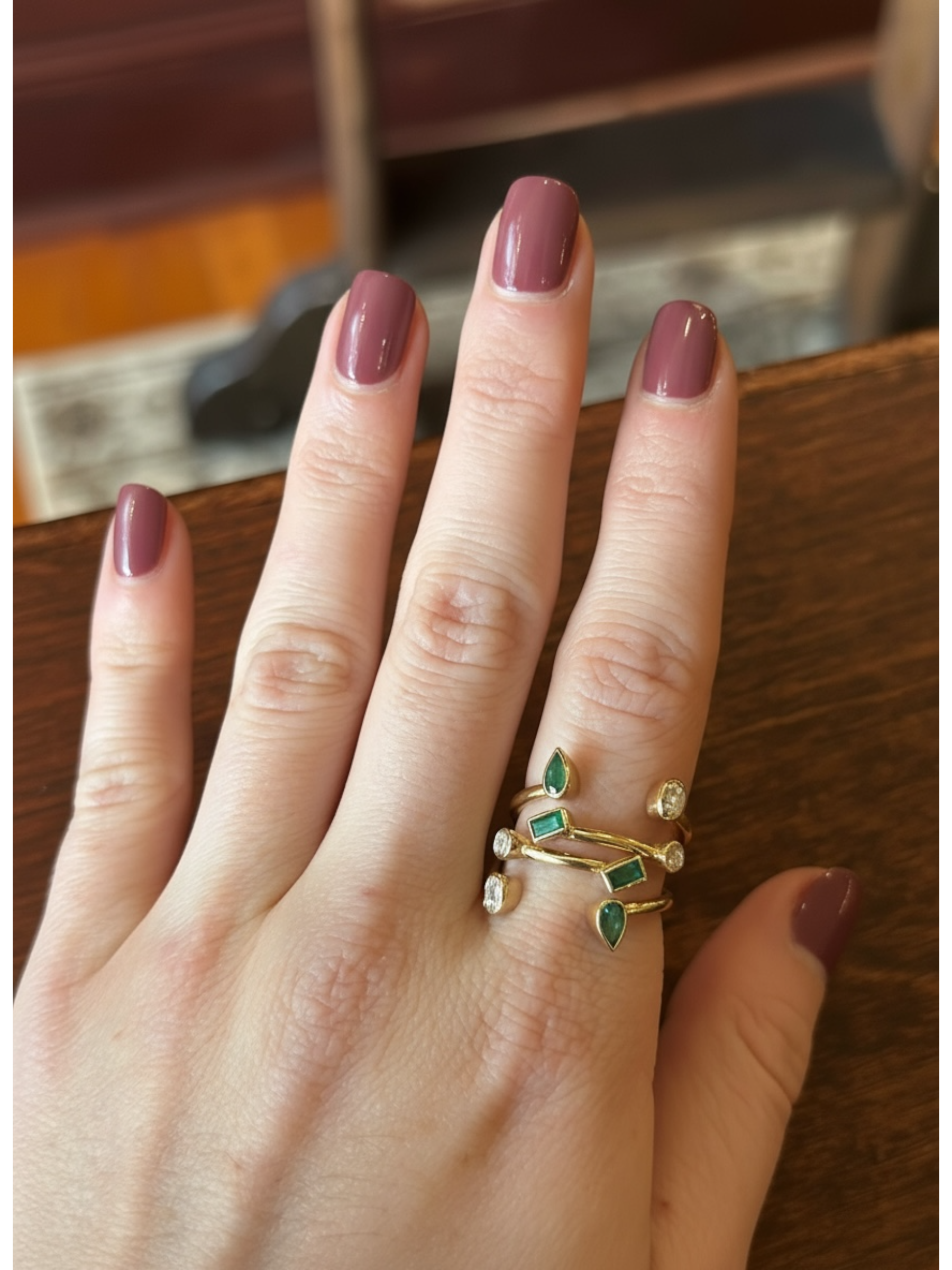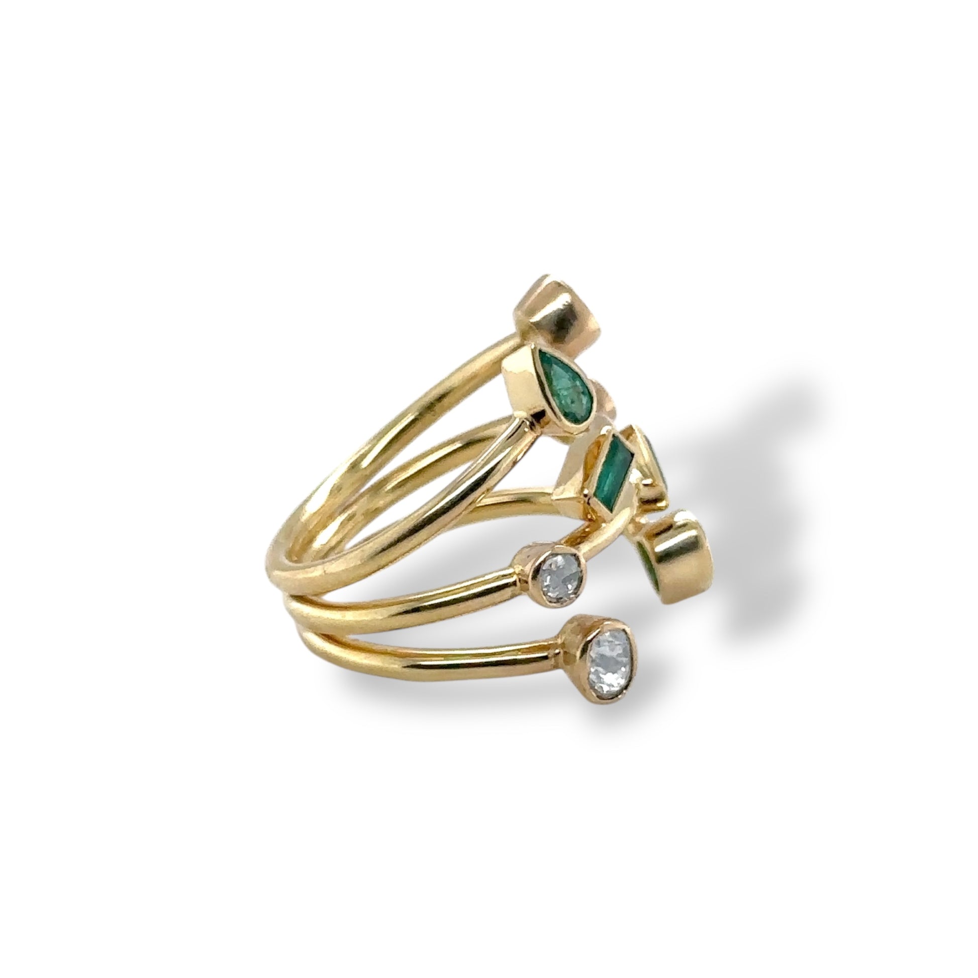 This sculptural ring captures the essence of modern luxury through its open, geometric design. Crafted in 18k gold, it features bezel-set diamonds and emeralds in varied cuts that dance across the hand like light filtering through leaves. The interplay of precious stones creates a dynamic, organic composition that balances clean lines with natural beauty. A refined piece that speaks to understated elegance and contemporary craftsmanship.