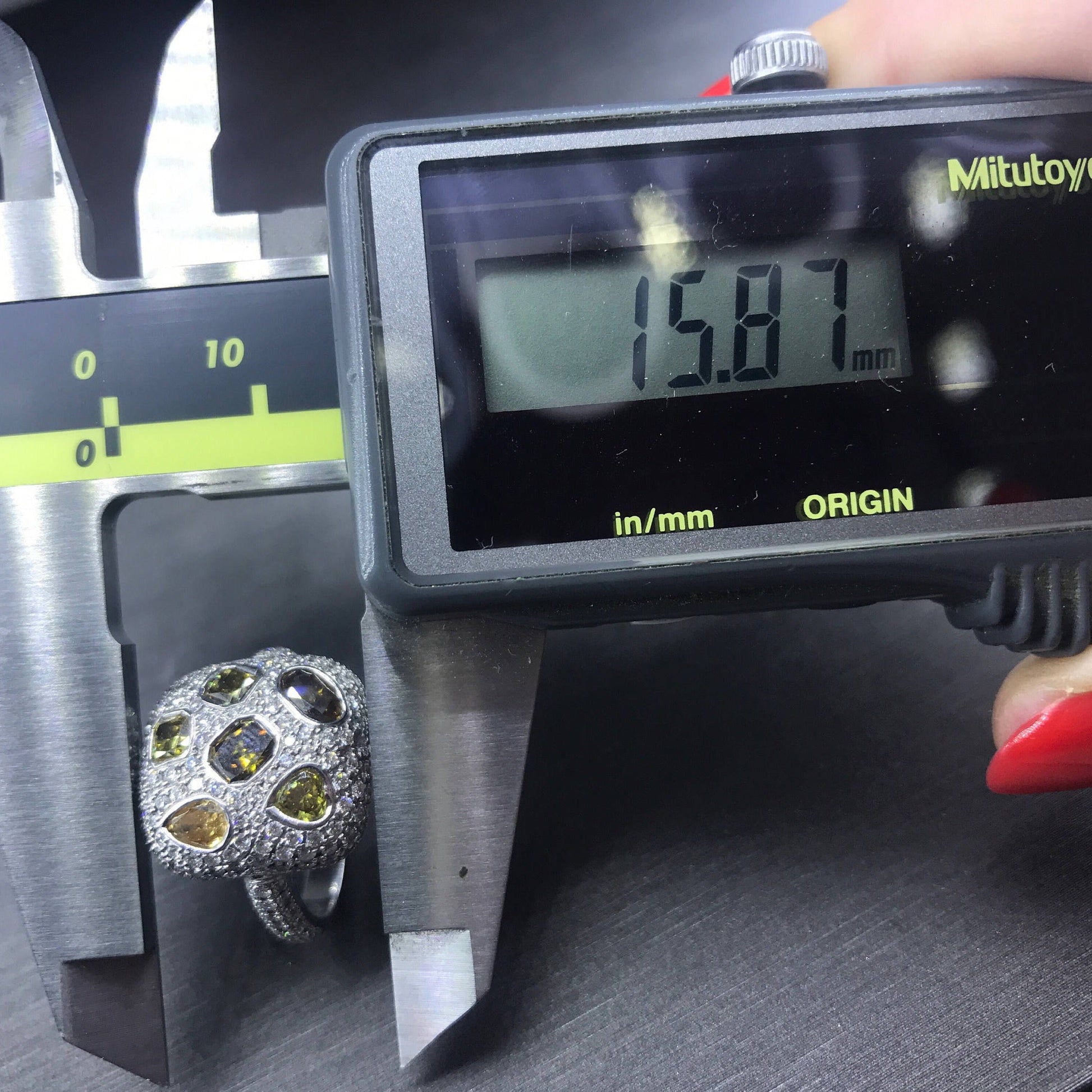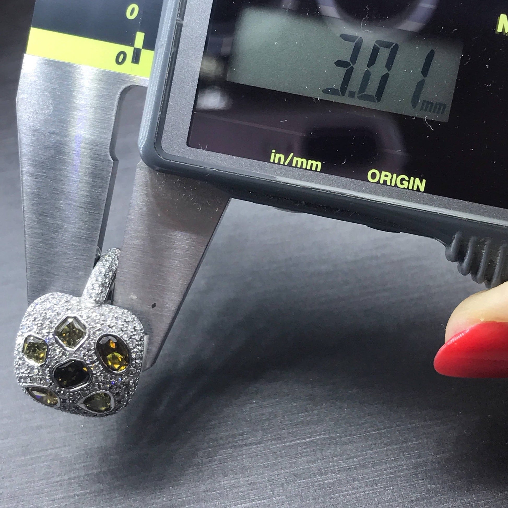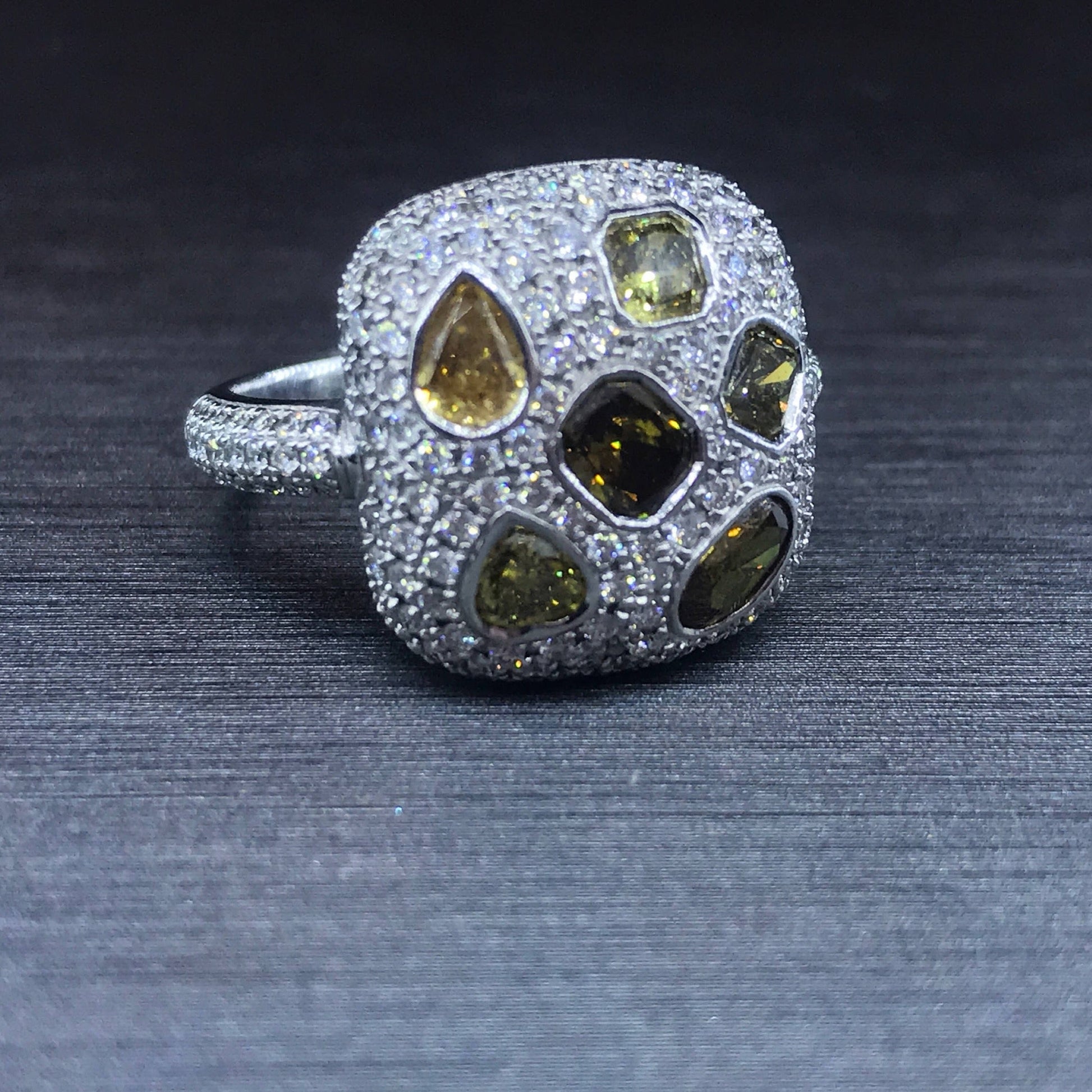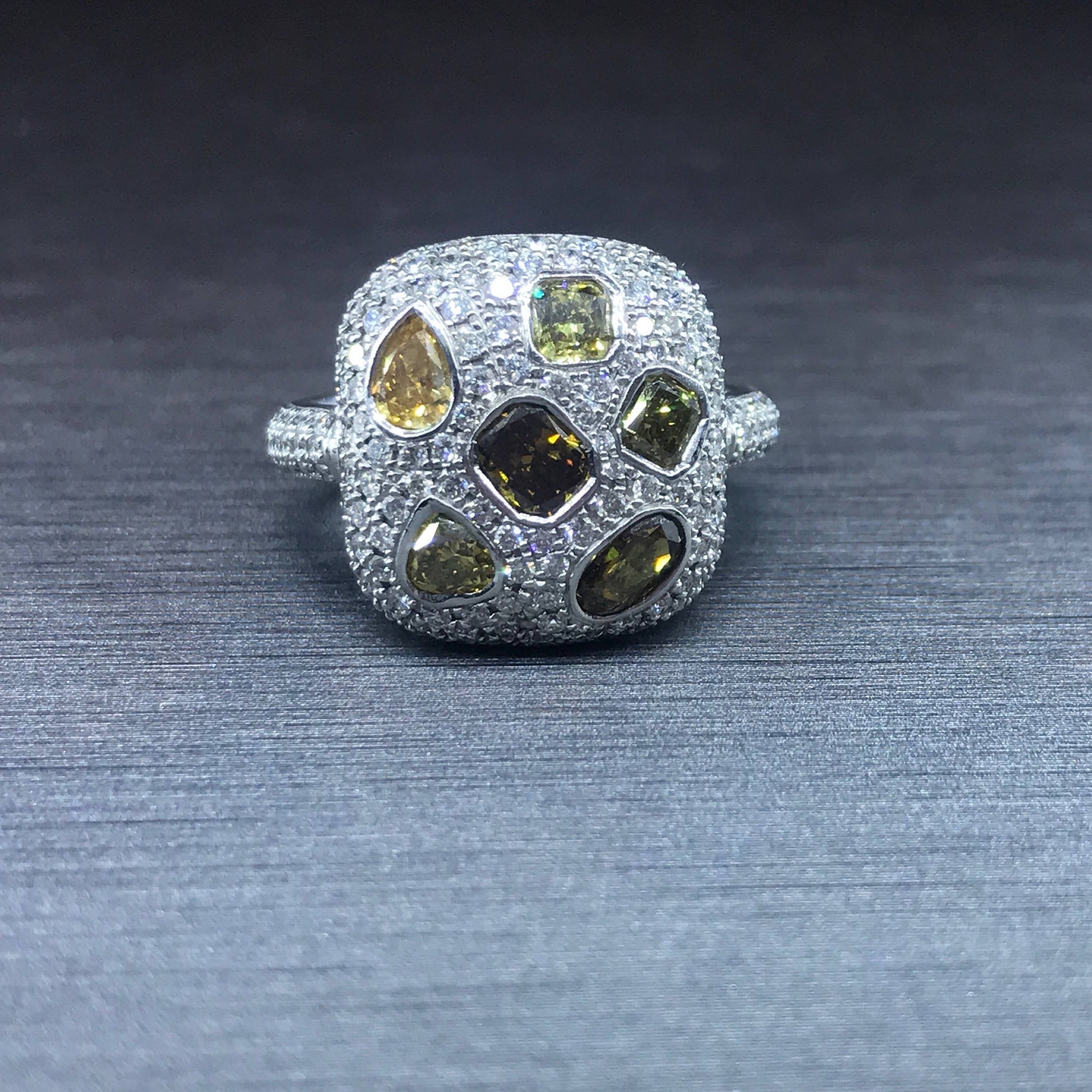 These fancy colored diamonds range from fancy light yellow, pinky brown to orangey brown. The shapes range from cushion, oval and pear. The design of the ring is so comfortable to wear. The rounded body is so perfect for everyday wear.