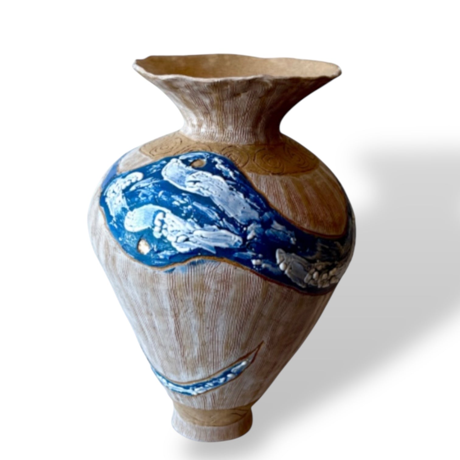 She uses traditional hand-building techniques of pinch, coil, and slab. Her tactile, organic vessels are rough and smooth, painted, glazed, unglazed, carved, flawed and scarred, embodying the emotional resonance of her many memories. The vessels’ dynamic forms and surfaces reflect the vibrant diversity of her chosen home, Brooklyn, and of her lived experience