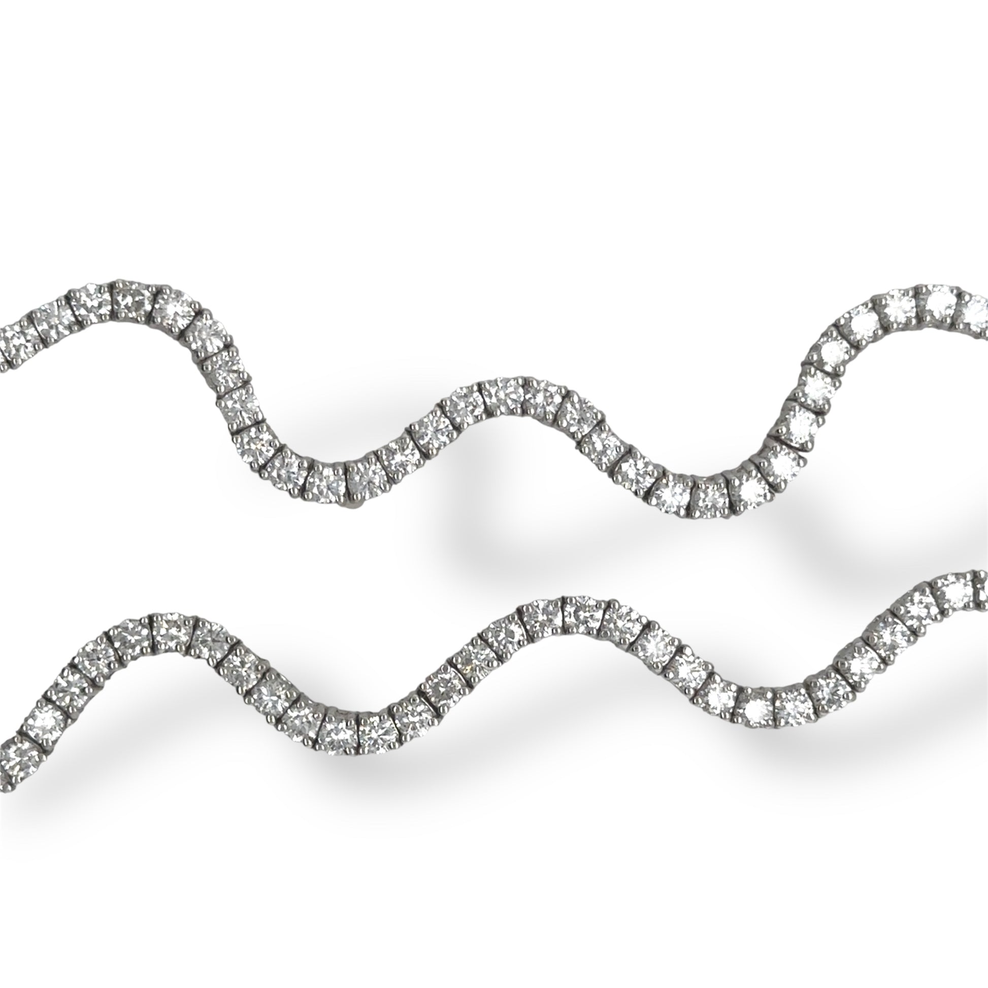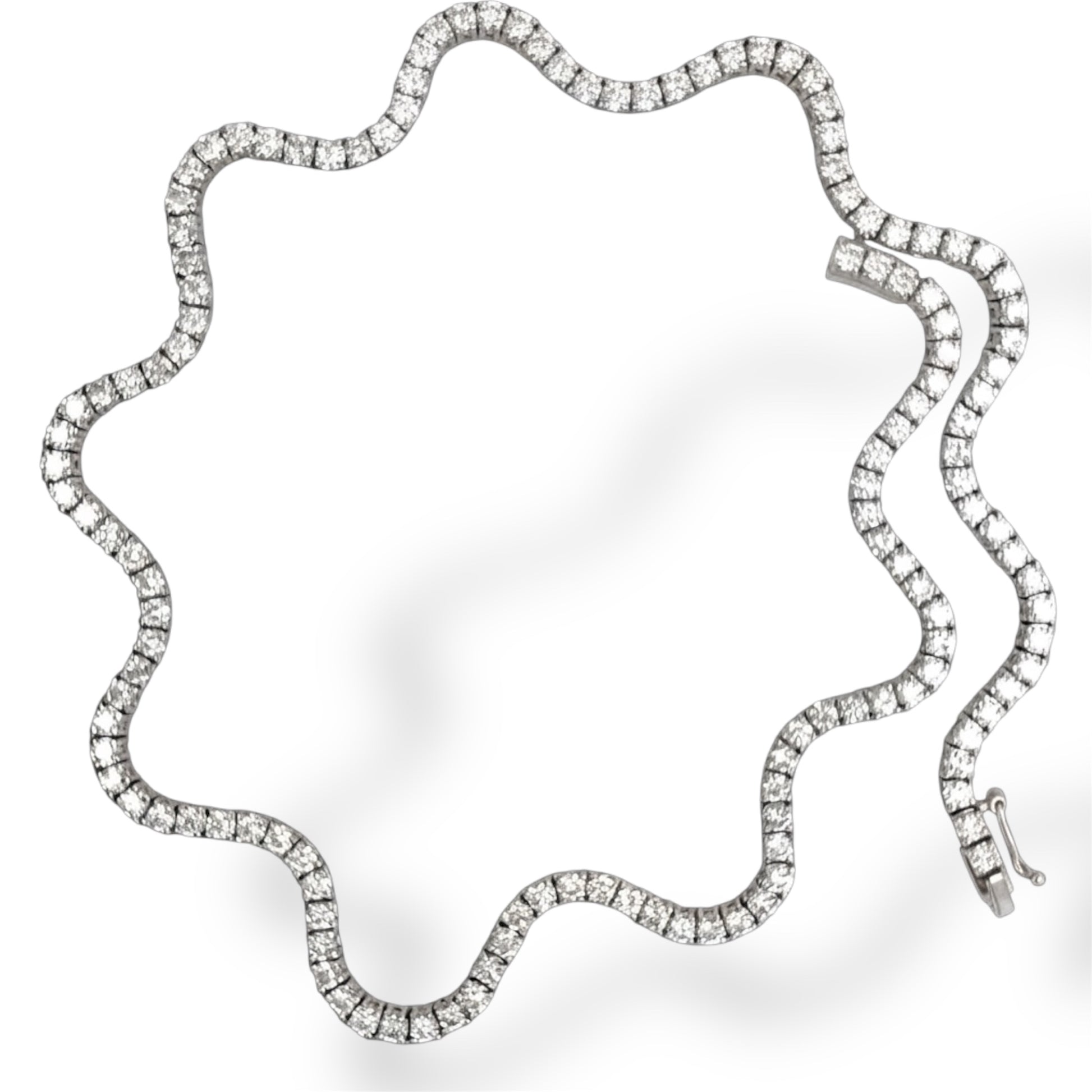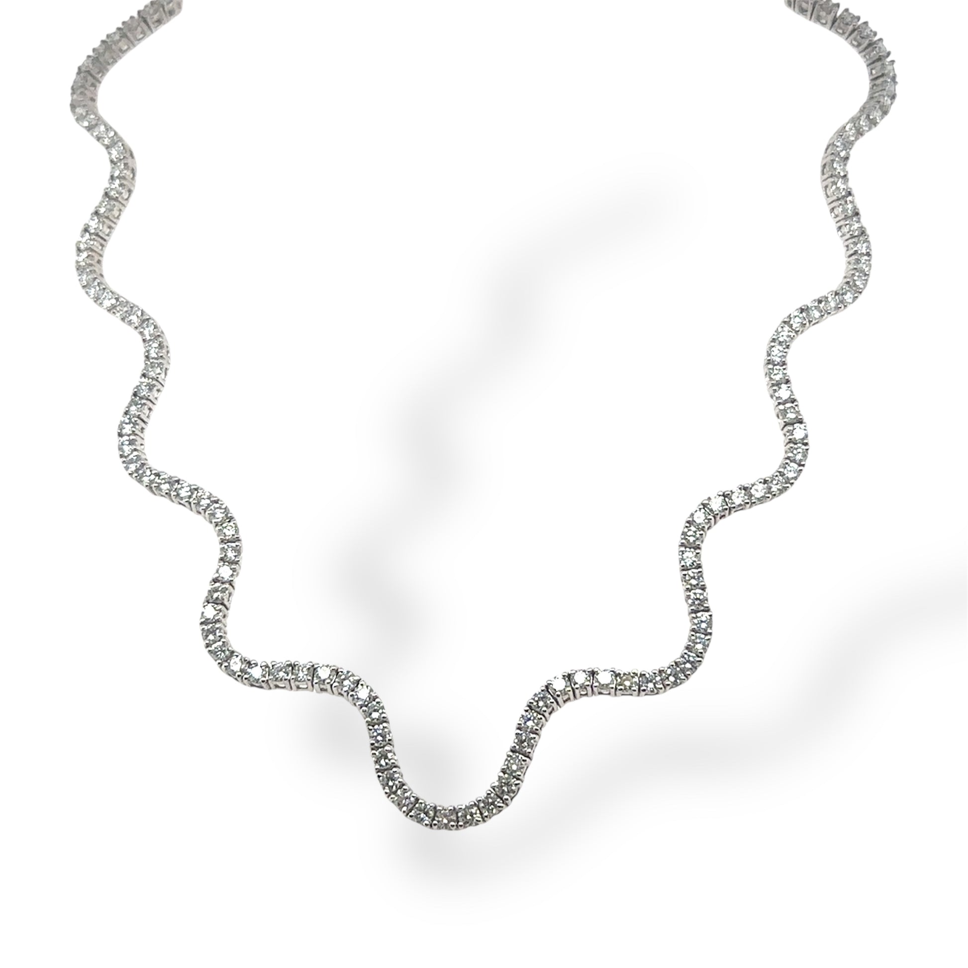 Elevate your jewelry collection with the Moonlit Wave Necklace, a sophisticated 18k white gold piece featuring 9.86 carats of diamonds set in secure 4-prong settings. Its distinctive wave-inspired silhouette commands attention as a refined statement piece, perfect for both special occasions and elevated everyday wear. The design pairs seamlessly with the Moonlit Tides Bracelet for a coordinated, luxurious look. A timeless investment in enduring elegance.