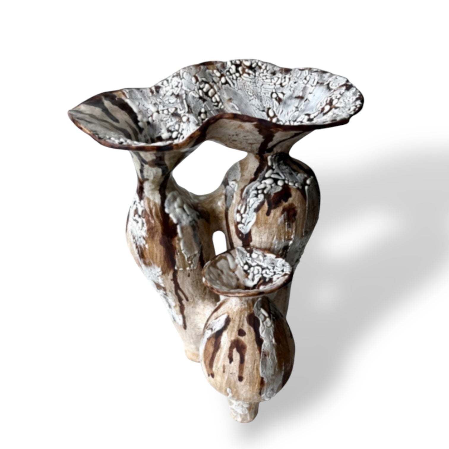 She uses traditional hand-building techniques of pinch, coil, and slab. Her tactile, organic vessels are rough and smooth, painted, glazed, unglazed, carved, flawed and scarred, embodying the emotional resonance of her many memories. The vessels’ dynamic forms and surfaces reflect the vibrant diversity of her chosen home, Brooklyn, and of her lived experience