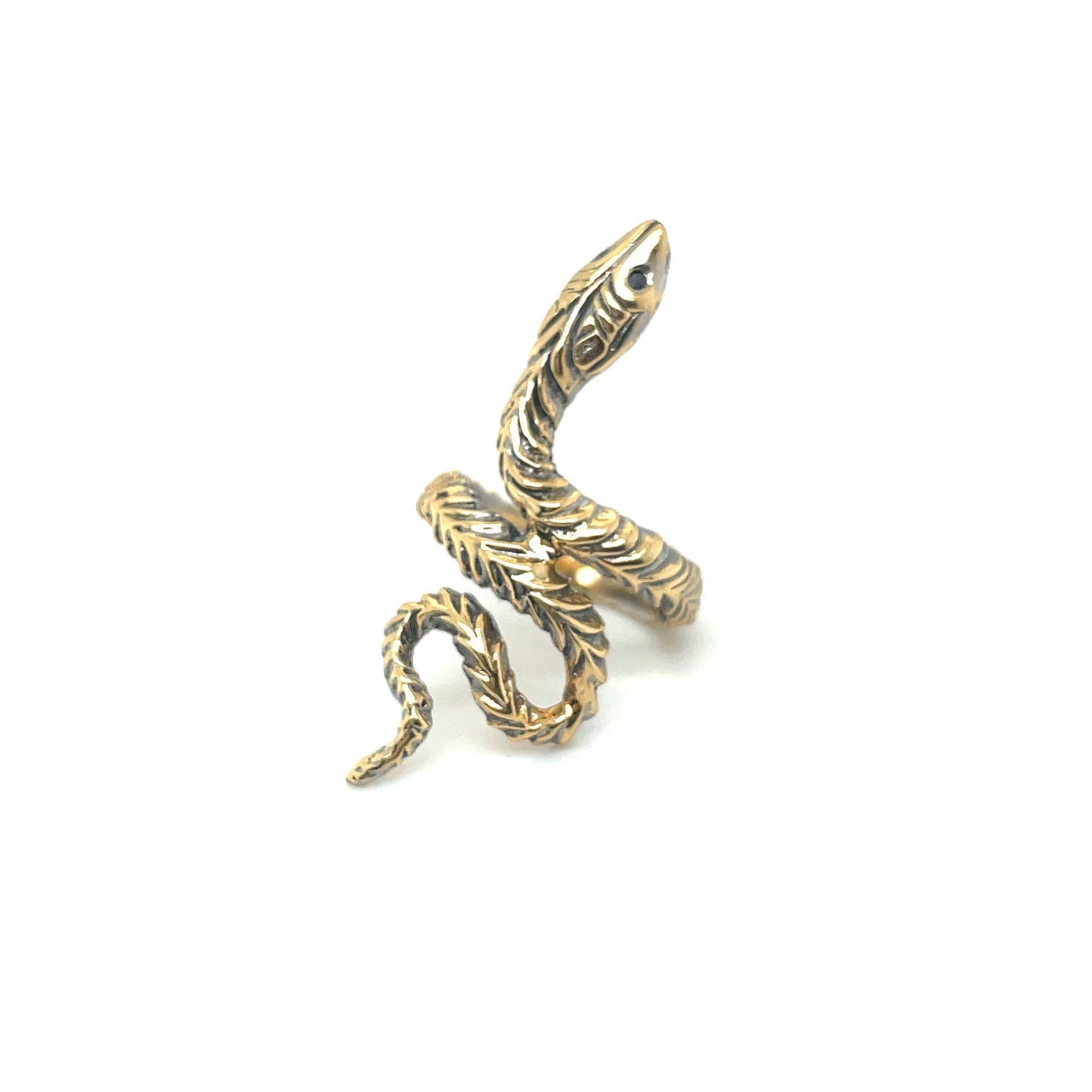 This Serpent ring is crafted in 18k yellow gold. It features a black rhodium antiqued finish. The eyes hold .02ct black diamonds.