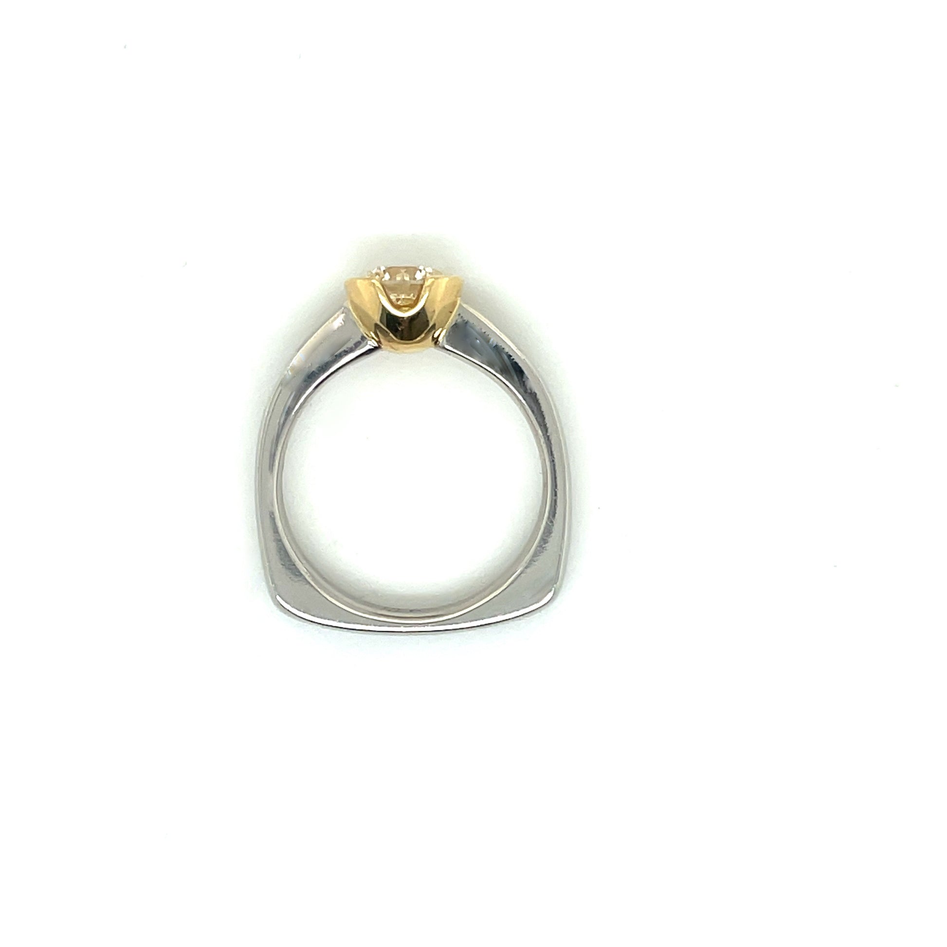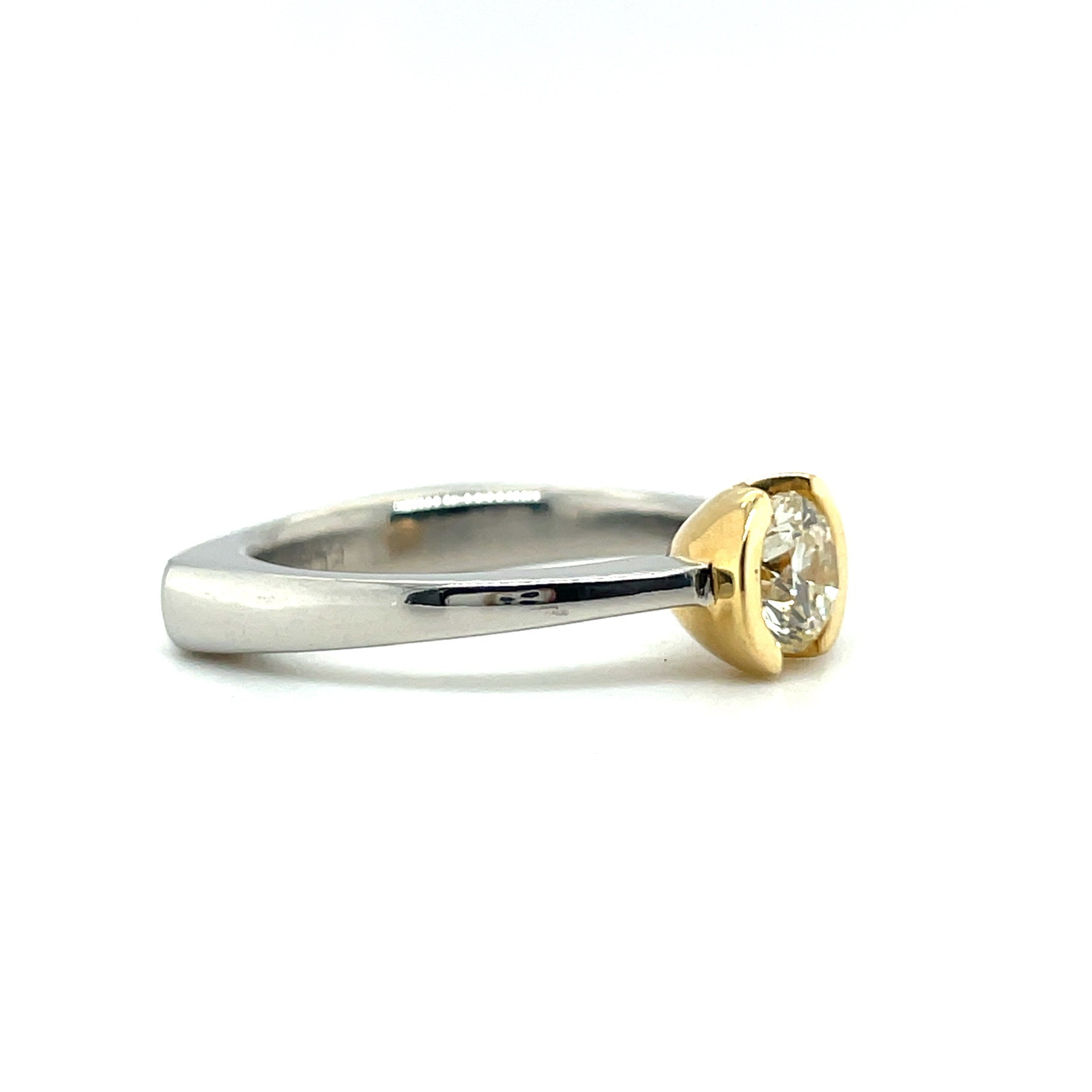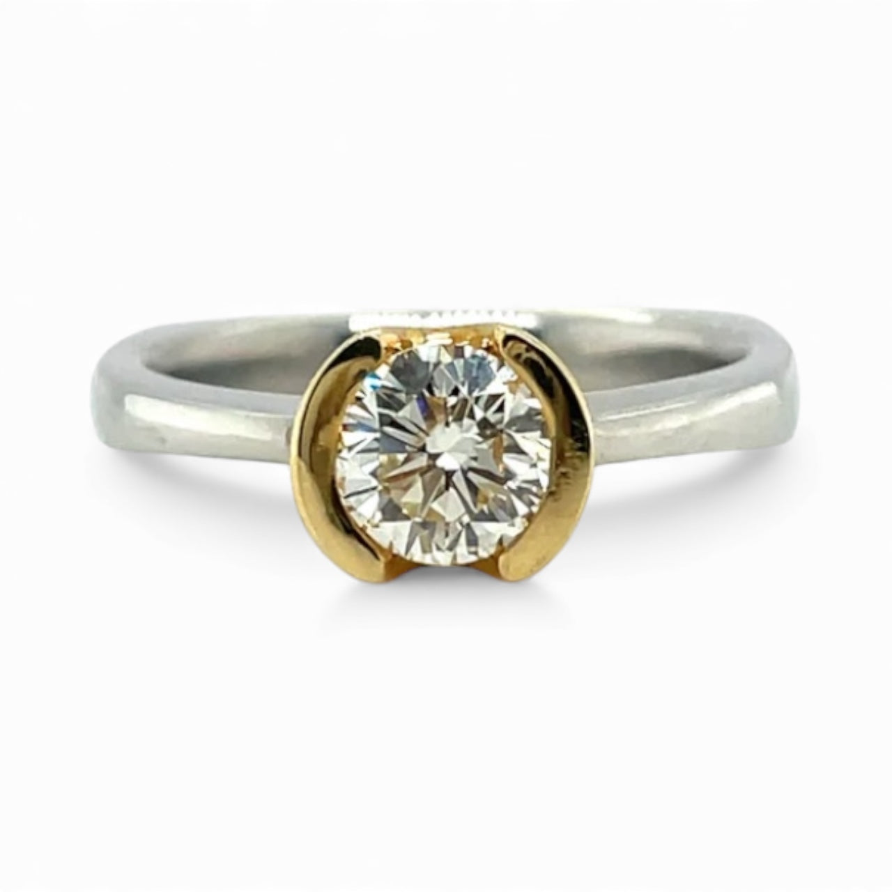 Two tone solitaire engagement ring, hand crafted in 18K yellow gold and platinum.