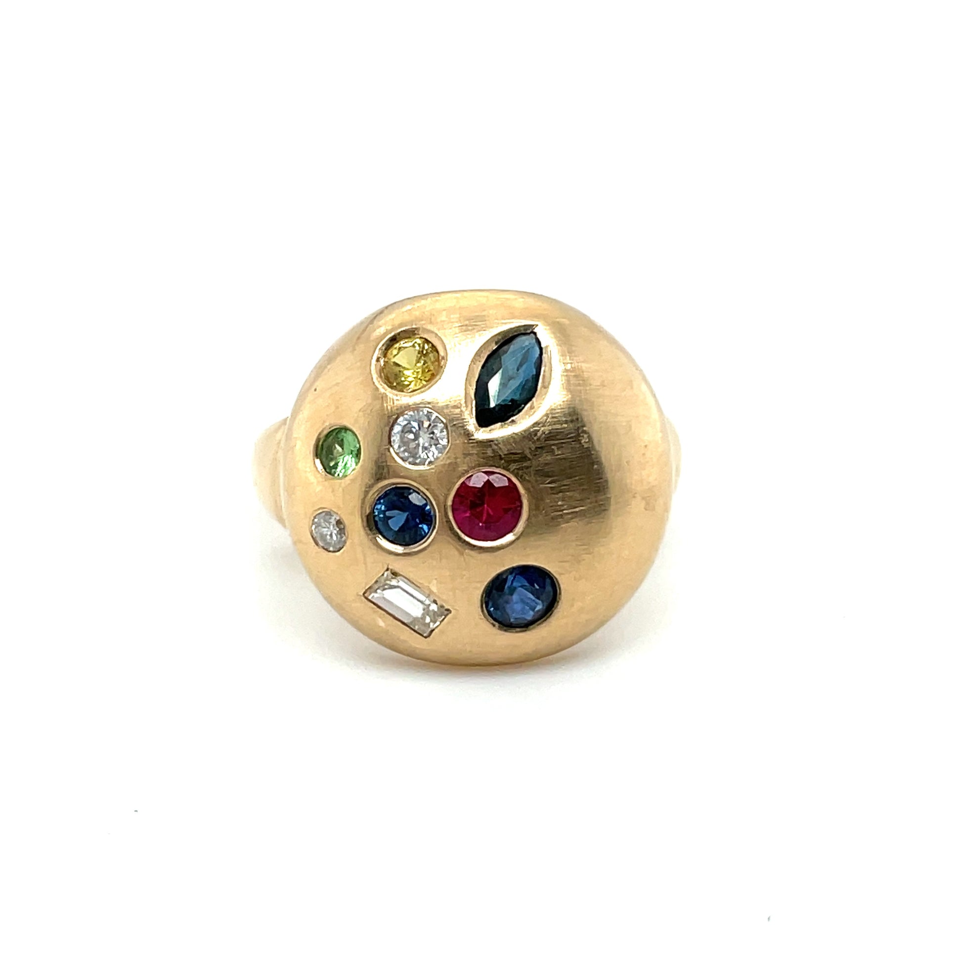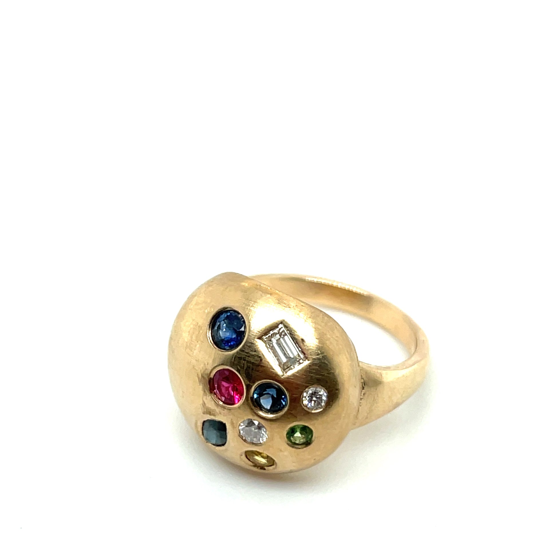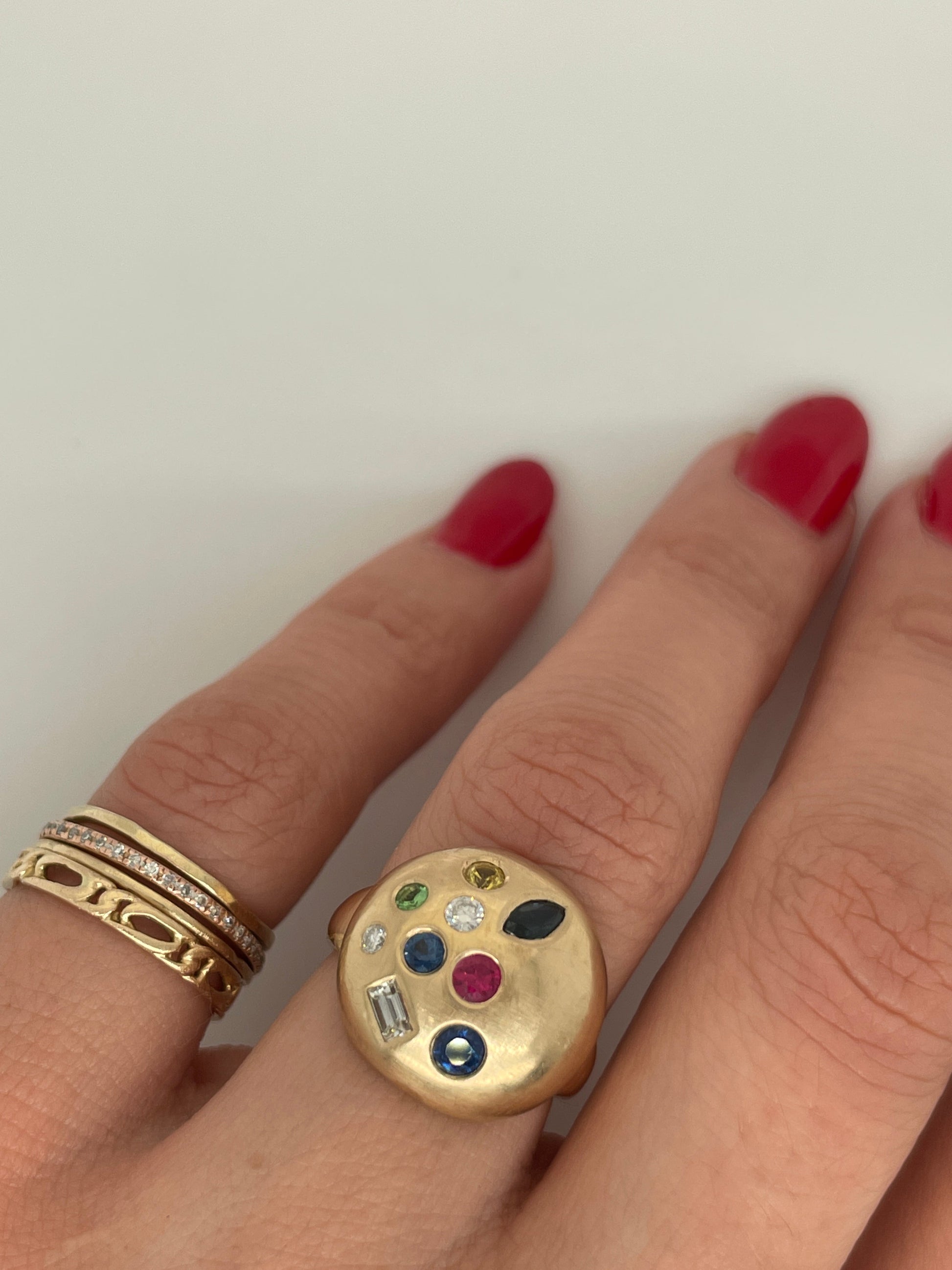 The "Sprinkles of Gems" ring features playful, randomly placed gemstones in 14K yellow gold.