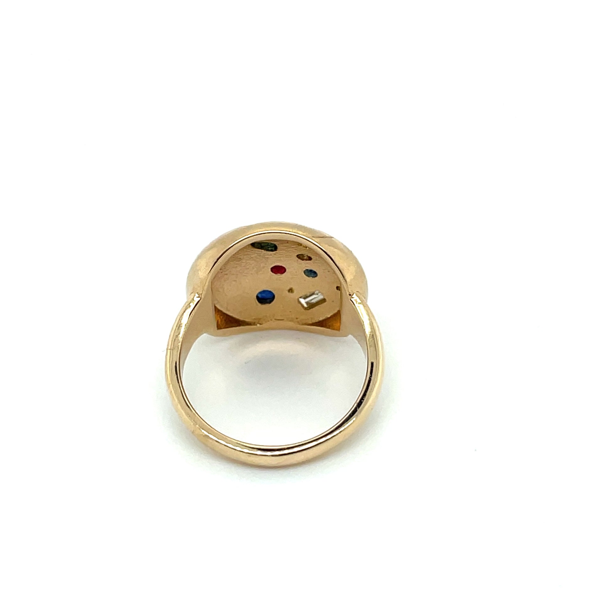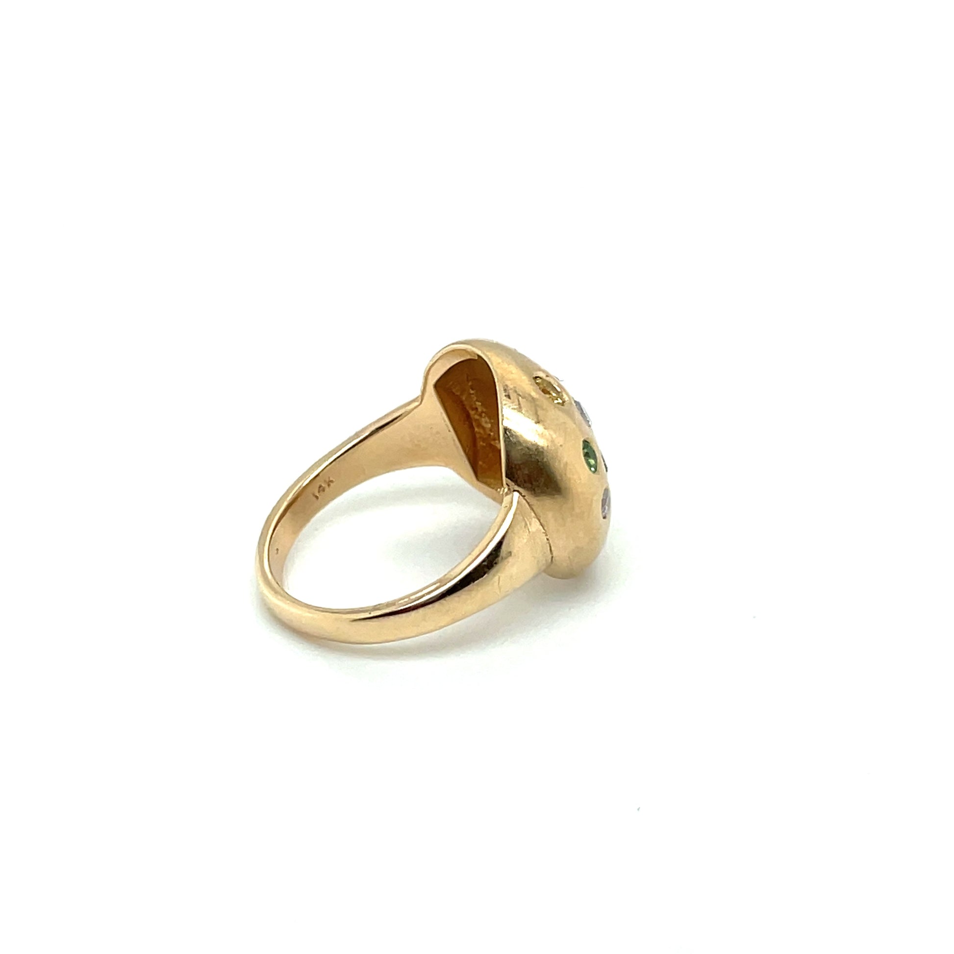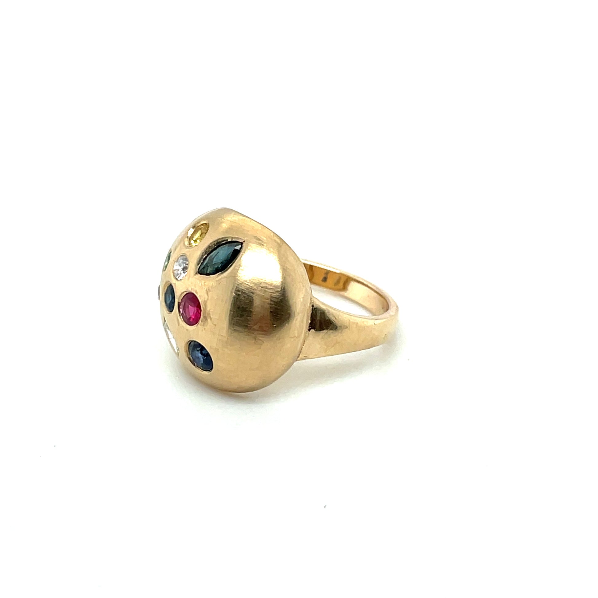 The "Sprinkles of Gems" ring features playful, randomly placed gemstones in 14K yellow gold.