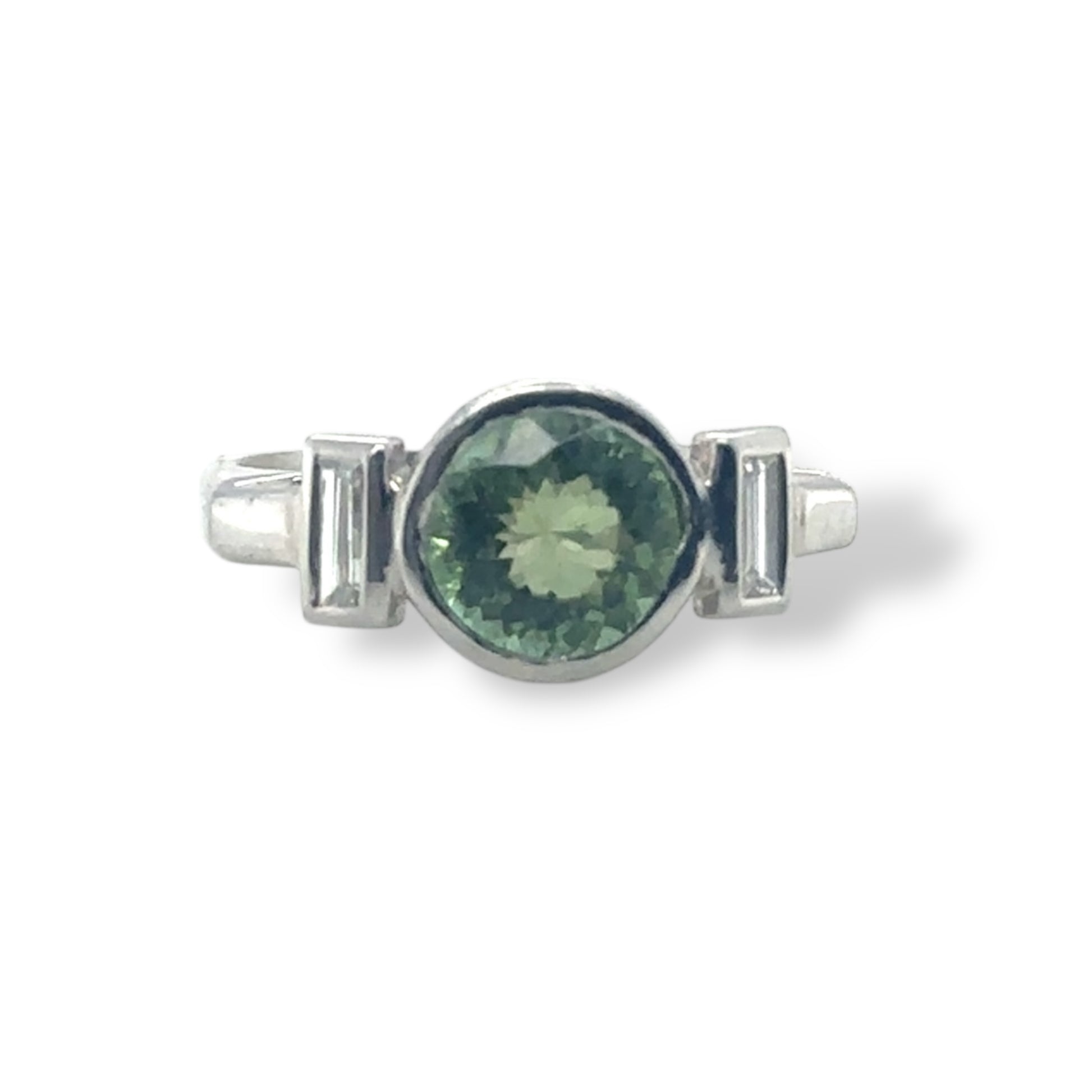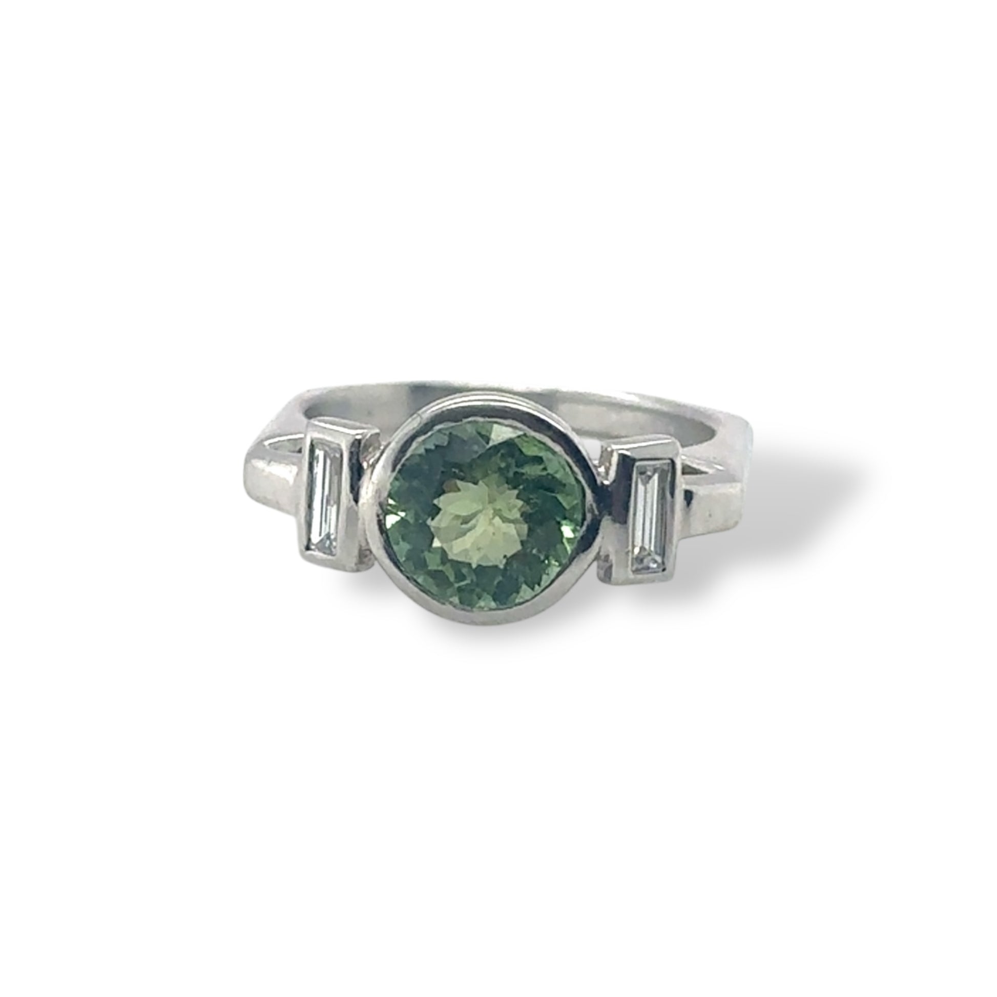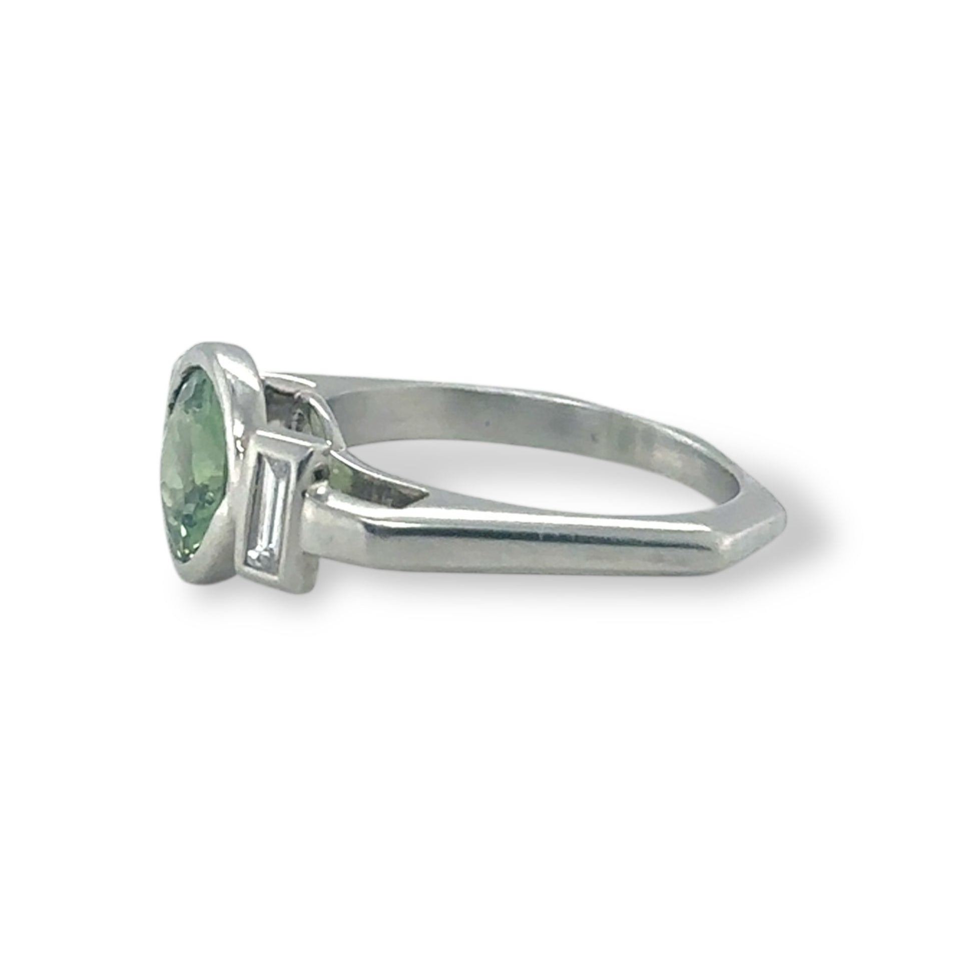 The Minted Tourmaline ring features a stunning 1.50ct green tourmaline, elegantly accented by two straight baguette diamonds totaling 0.20ct. Each gem is securely set in a polished platinum bezel, lending durability and a sleek finish. Weighing 6.79 grams, this uniquely shaped piece combines exquisite craftsmanship with the vibrant energy associated with tourmalines, known for their ability to balance chakras and cleanse the aura. This ring offers a distinctive and meaningful alternative to traditional diamond engagement rings.