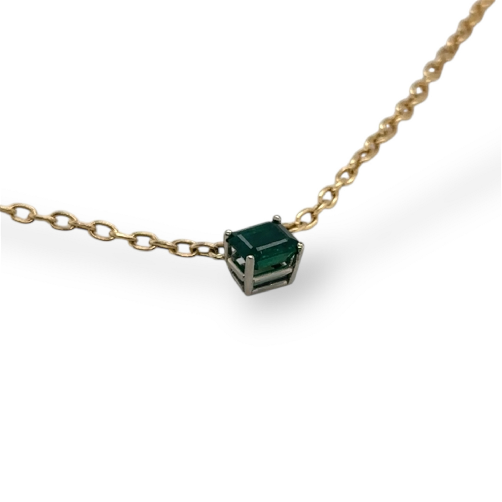 This Verde Bell pendant showcases a natural emerald set in 14k white gold, suspended from a contrasting 14k yellow gold chain. The stone's soft warmth becomes captivating as light passes through it, revealing the rich green hues that define its character. The interplay of white and yellow gold creates an elegant foundation that allows the emerald to command attention while maintaining refined sophistication.