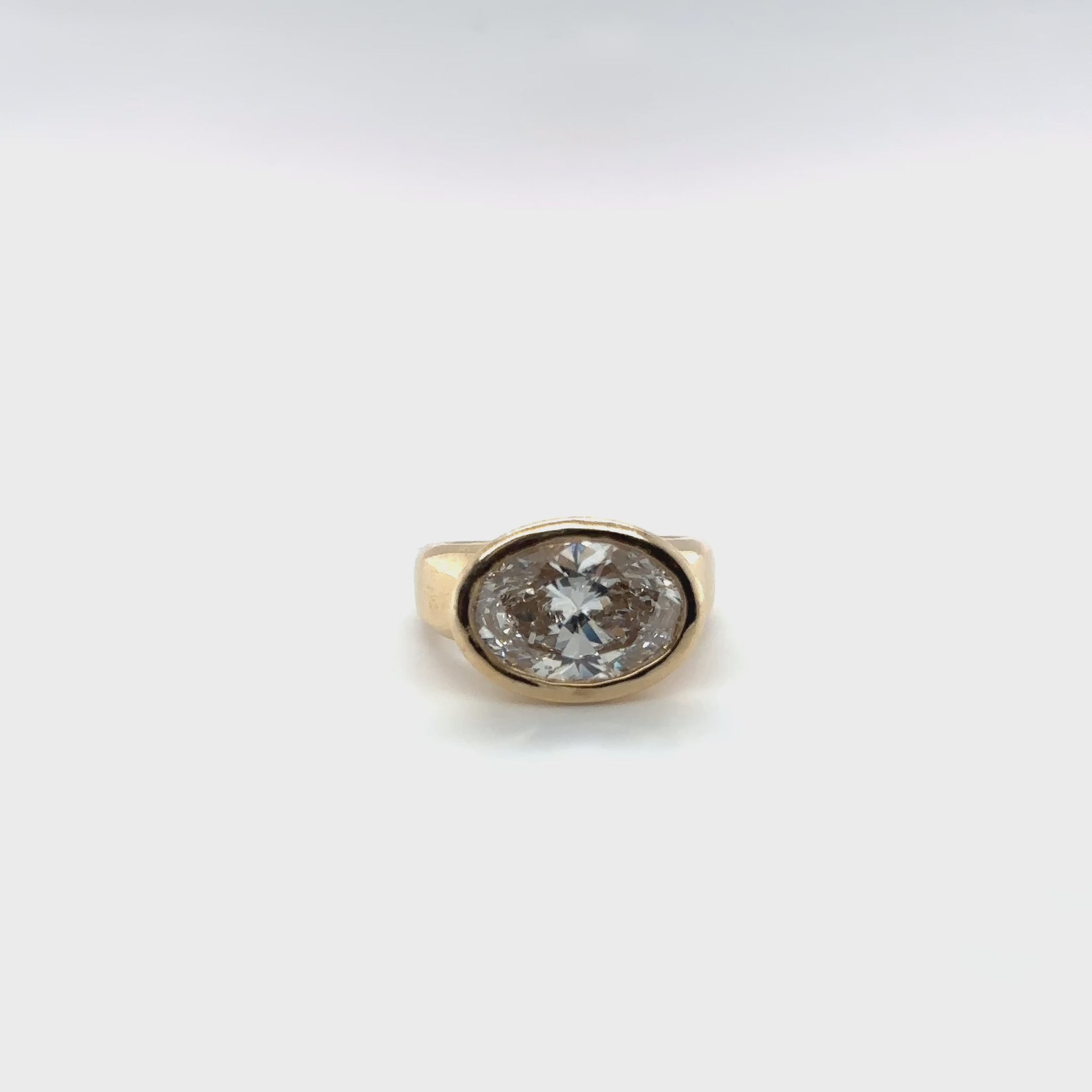 The Zolara Ring showcases a stunning 4.33-carat oval diamond set in a luxurious yellow gold band, oriented east to west for distinctive visual impact. This timeless piece combines refined elegance with exceptional brilliance, featuring a carefully crafted setting that complements the diamond's natural radiance. Perfect for those seeking a sophisticated statement that transcends fleeting trends, the Zolara delivers enduring beauty and understated luxury.